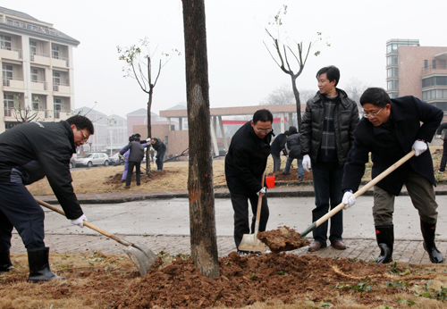 上午9时许,两级领导等一百余人来到东和公寓,他们自发地组成植树小组,合力把树苗移入坑中,移正竖直,再用铁锹培土、夯实。不一会儿,沿着大草坪栽下一棵棵行道树苗,也种下一份份希望。有的干部记下自己植树的位置,说“20年后再来看看这些树是很有意义的”。大伙儿干得热火朝天,一个多小时,在欢声笑语中种下了56棵碗口粗的香樟树苗。据悉,东和公寓是今年学校绿化的重点,植树节前后还将种下一批树苗。