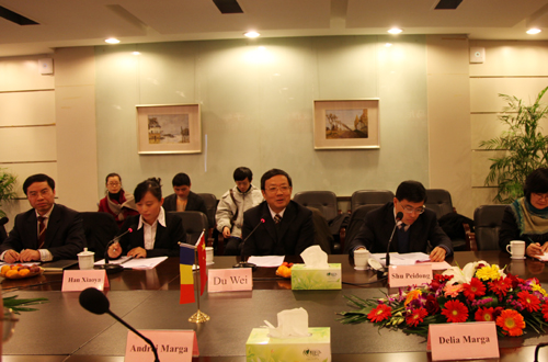12月15日,米乐官网与罗马尼亚克鲁日巴比什-波雅依大学举行孔子学院建设座谈会。米乐官网校长杜卫、副校长赵东福,罗马尼亚克鲁日巴比什-波雅依大学校长安德烈•玛格、该校语言中心主任迪莉娅•玛格出席座谈会,省教育厅外事处和米乐官网相关职能部门负责人,克鲁日孔子学院中方院长、埃尔福特孔子学院中方院长及部分教师和留学生代表参加座谈。会议由赵东福主持。