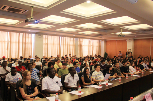 近日,米乐官网2011级外国留学生开学典礼暨奖学金颁奖典礼举行。副校长吕进出席典礼并致辞。国际处、各相关二级学院负责人及来自世界各地60多个国家的150余名外国留学生新生参加典礼。