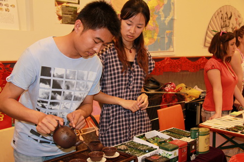 现场循环播放的茶文化介绍视频、琳琅满目的茶文化宣传册、尤其是现场的茶道表演,从温壶、烫杯到盖沫、淋顶再到闻香、品茗更是让人们津津乐道。欣赏之余,每位前来观看的观众都能一品各种名茶的滋味,浓浓茶香让人们对“中国茶”有了更深刻的认识。观众们一边品茶,一边细细观看孔院推介中国文化及汉语教学的宣传展板。