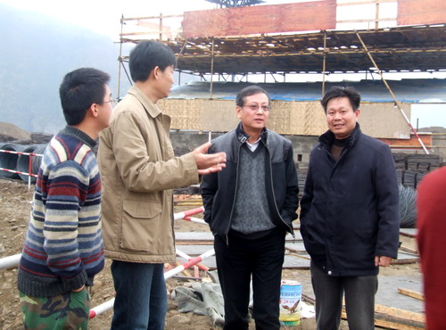 徐志平在米乐官网援建干部林洪青(左二)等陪同下现场考察援建项目 人事处