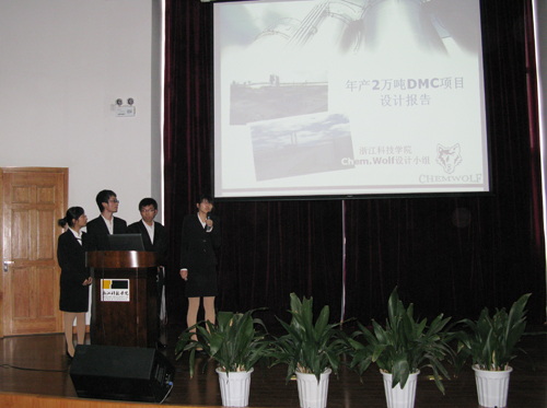 本届比赛,选手们对绿色化学品碳酸二甲酯进行工厂化设计,从厂址选定、工艺确定、设备选型及经济核算等全部由队员完成。决赛场上,每组选手用PPT进行陈述,接受评委和观众提问,队员的表现50%由评委决定,另外50%则由队际互评决定。经过激烈角逐,米乐官网获二等奖和优胜奖各一项。