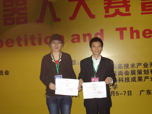 图为陈军统老师(左)和杨舒捷参加中国机器人大赛获奖后合影留念