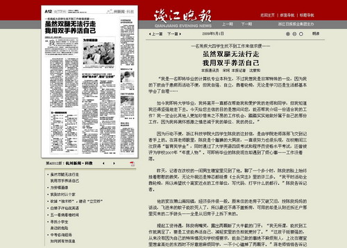 “信息学院力助残疾毕业生陈良就业”经校报、校园网报道后引起了社会媒体关注。5月1日出版的《钱江晚报》杭州新闻•科教头条为陈良向社会发出了求职信《虽然双腿无法行走 我用双手养活自己》。(http://zjdaily.zjol.com.cn/qjwb/html/2009-05/01/content_4753358.htm)