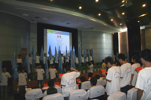 接过沉甸甸的旗帜,全场同学以青春的名义庄严宣誓:“我将矢志不渝地,捍卫这个信念——开明、开放、开阔、开朗、开拓。挥洒无尽的热情,贡献无穷的智慧,创造无悔的明天;畅想改革三十年,唱响青春主旋律,走进百强县,服务两创谋新篇。”