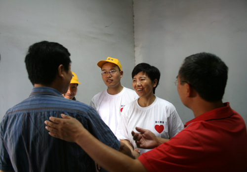 这里的学生也非常喜欢我们,他们通过发短信的方式对我们的到来表示欢迎和祝福,有的说:“谢谢!有你们的关心,我们会很快走出阴影,迎接前方美好的人生。为了我们的目标而奋斗,-:)这边天气多变,注意防暑降温-:)”收到这样的短信,幸福感油然而生。走在学校的路上,一些学生都会主动地与我们打招呼,或者真诚地微笑。这边的老师也很欢迎我们,经常会有不认识的老师,伸出手与我们握手,并说我们辛苦了,你们的工作很有意义,这让我们感到很欣慰。