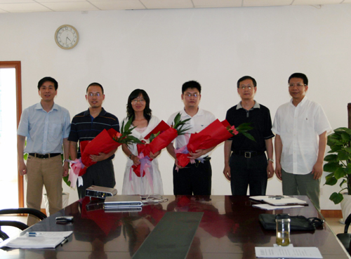 图为校领导与赛燕燕(左三)、俞林鑫(左二)、祝江鸿(右三)老师合影