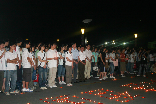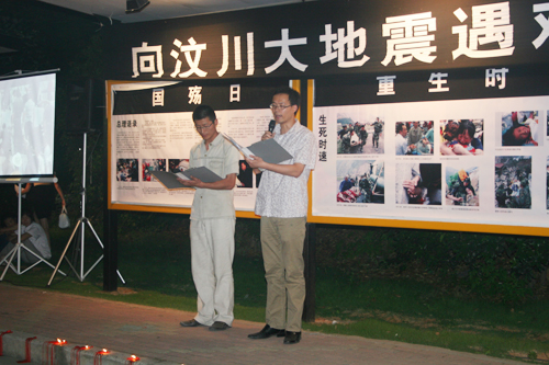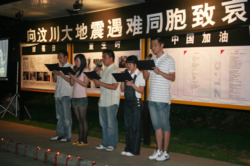 点点烛光汇聚成的希冀中,“汶川挺住,祖国万岁”大型诗歌朗诵会缓缓落下帷幕。