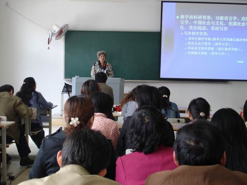 报告中,方琰教授介绍了对英语写作及教学实验的认识以及英语写作教学实验的方方面面,并重点讲述了语言学框架和教学路子、调查研究写作教学和教材情况、编写教材或教案、教学实验设计、科学分析实验结果等。讲座深入浅出,激情洋溢,既有理论阐述,又有具体的课堂教学个案分析,使教师们受益匪浅。