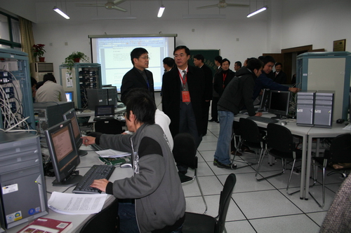 在信息学院计算机通信实验室,学生正在进行相关实验。在听取介绍后,专家翻阅了实验记录,并与师生进行了简短交流。