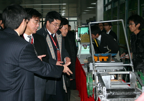 随后,专家组一行来到机械学院在建省级示范试验中心。学院负责人向专家们介绍了实验室建设和开展教学活动的有关情况。学生机械设计作品正在展出,学生发挥创意,自己设计自己制作的作品吸引了专家的注意。