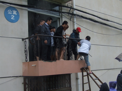 4号楼最后一名学生转移了,徐师傅的双肩已经发麻,他还涉水进入楼内,一间一间寝室确认还有没有学生被困在里面。确认完毕后,他顾不上休息,又蹚水前去支援其它几幢楼的转移工作。这时,水越涨越高,几幢公寓的门已经被水封住,学生们都聚集在二楼、三楼。为转移2号楼的女生,徐师傅背着梯子,顺着排水管道爬上二楼,因连续救人体力下降,塑料管道遇水又滑,他从2米多高摔了下来,手掌心被碎石划出了一道2寸多长的口子,顿时鲜血直流。一旁的辅导员都劝他太危险、不要再爬了,可是他顾不上疼痛和个人的安危,屏住呼吸继续往上爬,终于爬上了二楼阳台。木梯太短,够不到地面,徐师傅就从学生寝室借来两根长跳绳,用绳子加长梯子的长度,将梯子抛到地面,由辅导员协助扶住梯子下端,自己则把绳子牢牢地绑在腰上,保证梯子的稳固,护送女生一个个转移出去。