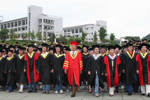 活动进行前,校长杜卫与各二级学院负责人身着导师服与毕业生代表合影留念。
