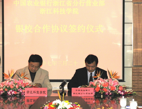 校长杜卫和中国农业银行浙江省分行营业部党委书记、总经理汪勤在协议书上签字。