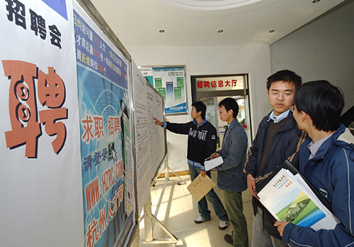 图5:建工学院2003级学生在杭州市人才市场公告栏前查看最新人才招聘信息。不少大学生抓住寒假的时间主动出击,寻找就业机会。