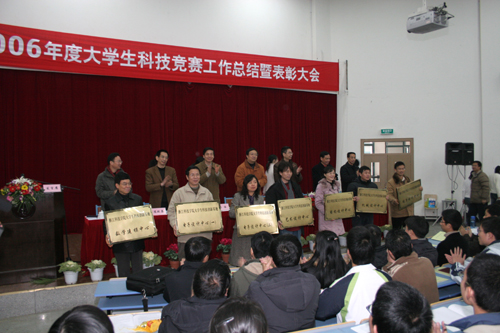 1月11日下午,在2006年度大学生科技竞赛工作总结表彰大会上,校长杜卫宣布校大学生科技创新基地成立。杜卫和出席表彰大会上的校党委副书记陈浩、副校长龚建立为基地下属12个中心授牌。