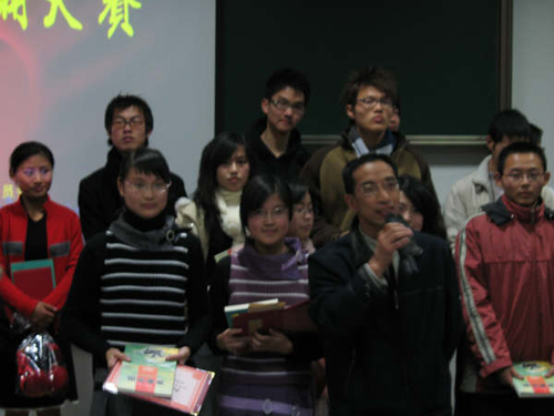 本次大赛策划到闭幕历时一个半月,进入决赛的个人组12位同学和团体组的六个组的同学是历经初赛、复赛,从报名的个人组近200名同学和团体组的54组同学中脱颖而出的。经过决赛紧张激烈的争夺,最后,来自理学院应用物理052班的徐晟获个人组第一名,同样也是来自理学院的信计04A班的严丽莉、钟晓静获团体组冠军。整个决赛现场气氛热烈,观看比赛的老师和同学随着选手们声情并茂的朗诵或喜悦或悲伤,或激昂,或愤怒,完全沉浸在选手们所营造的诗文的意境之中。选手们对朗诵艺术的热爱和对诗文的准确理解与演绎,不仅使前来观看的师生陶冶了情操,同时也使大家享受了一场语言艺术的盛宴。
