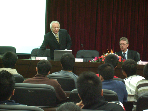 德累斯顿技术经济大学副校长Stenzel教授首先介绍了德累斯顿技术经济大学的历史、发展规模以及专业设置情况,同时还做了“半导体器件的数字仿真”报告;德累斯顿技术经济大学的电子系主任Huebner教授介绍了他们学校电子专业的办学情况,同时还对他们的特色专业 “汽车电子”进行了详细的介绍,并用软件演示了汽车电子运行过程中的动态仿真结果。