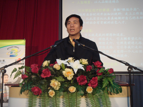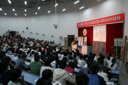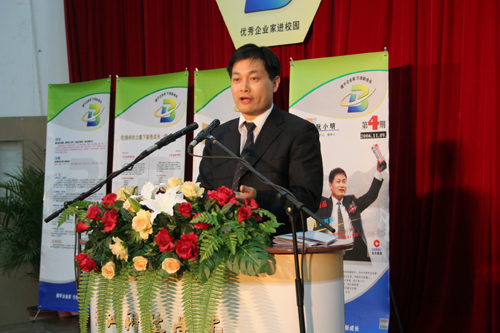 开幕式后,第四期 “握手企业家,引领新成长”优秀企业家进校园活动开始。在同学们热切的目光下,宝石控股公司董事长、党委书记阮小明“以人品制造精品”为主题向同学们讲述了他在挫折中不断学习,在逆境中不断成长,从一个农家穷孩子转变为一个成功企业家的创业历程。从10年前的2000元裂变到今日的5亿元,当初仅靠初中文凭就出来闯荡而今获得了“全国经营管理大师”、“全国质量管理先进工作者”等荣誉,同学们为阮小明独到的管理理念以及创造的管理奇迹所折服。“我希望大学生能做到‘眼低手高’,在学校认真学好专业课程、充分利用业余时间开拓知识视野;走上工作岗位后从做好每一件细小的事情入手,认认真真地做好自己的本职工作,在工作中不断成长,成为一个对社会有贡献的出色人才”, “理想是火,它点燃希望之灯;理想是灯,它照亮前进之路;理想是路,它引导我们走向成功,宝石就是我的理想和追求”……同学们对他的激情演讲和幽默情怀不时报以笑声和掌声。