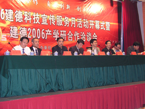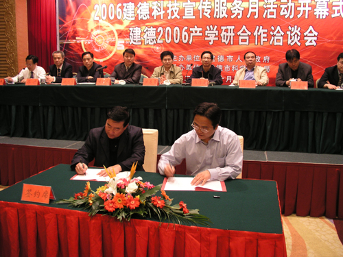 2006年建德科技宣传服务月活动开幕式暨建德2006产学研合作洽谈会于10月30日在建德市黄龙月亮湾大酒店举行。副校长吕进与米乐官网生化学院院长毛建卫、电气学院周克宁、何致远、项小东以及科技处有关老师参加了此次活动。吕进作为特邀嘉宾出席了开幕仪式和科技项目的签约仪式。