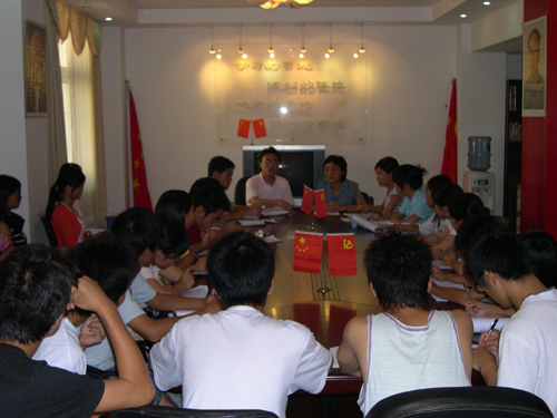 党总支书记曾翎希望学生党员干部加强学习,把十六届六中全会的精神传达到同学中去,发挥学生党员干部先锋带头作用,强调和谐社会、和谐校园的文明建设。她鼓舞学生干部发现身边和谐与不和谐的事情,通过自身努力为构建平安校园、和谐社会贡献自己的力量。