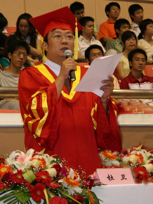 杜卫代表学校向即将告别母校、踏上新的人生征途的毕业生们表示最衷心的祝贺。他深情地对毕业生说:“大学生活如白驹过隙,瞬息即逝,但她确是你们瑰丽人生中最浓丽的一抹色彩!四年来,校园里留下了你们辛勤的汗水,奋斗的足迹和激扬奋发的青春豪情。你们的艰辛与努力,已结出了丰硕的成果! ”在毕业生们行将背起行囊,走向社会之际,杜卫给予他们殷切的希望:希望毕业生们爱岗敬业,踏实工作,勤勤恳恳,在平凡的工作岗位上建功立业;希望毕业生们勤于学习,勇于实践,团结协作,努力成才;希望毕业生无论身在何方都关注母校、支持母校、宣传母校,做学校忠诚的、热心的校友。