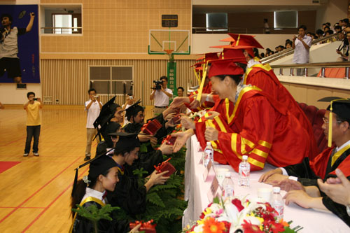 典礼上,身着导师服的校领导为身着学位服的毕业生代表一一扶正流苏,颁发学位证。校领导向优秀毕业生代表颁发了荣誉证书,向毕业生代表颁发了毕业证书和学位证书。