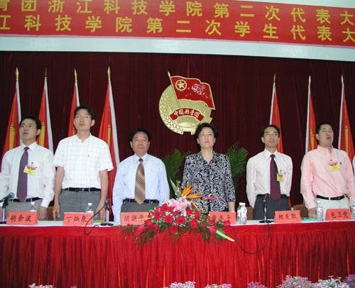 火红的五月,校园里鲜花簇拥,绿树成荫。共青团浙江科技学院第二次代表大会、浙江科技学院第二次学生代表大会于 2006年5月21日在小和山校区胜利闭幕。校党委副书记胡浙平,校党委委员、组织部长黄丰平,组织部副部长丁炳泉等出席了闭幕式,郑友取同志主持大会闭幕式。