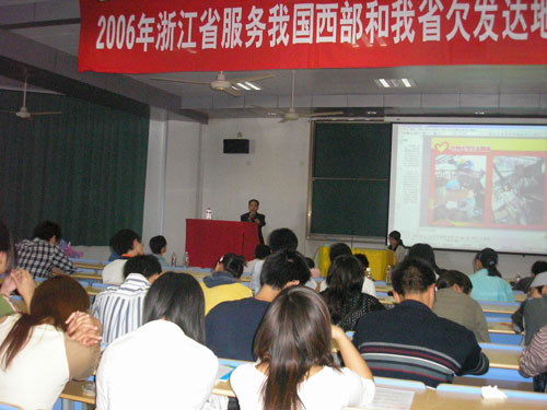 4月11日下午,米乐官网在C1-106举行2006年浙江省服务西部和我省欠发达地区优秀大学生志愿者事迹报告会,这标志着米乐官网今年“两项计划”志愿者招募工作正式启动。