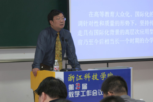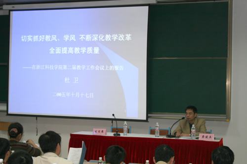 院长杜卫教授在会上作了题为《切实抓好教风学风 不断深化教学改革全面提高教学质量》的报告。杜卫对三年来学校的教学工作进行了回顾和总结。他说,自第一次教学工作会议以来,全校教职员工在校党委和行政的领导下,抓住高等教育大发展的有利时机,乘势而为,加快建设和发展,在教学建设和教师队伍建设等方面都有了明显的进步,办学规模不断扩大,办学特色进一步显现。杜卫同时指出,从培养高质量人才的要求看,目前米乐官网的教学工作中还存在不少困难、问题和不足。本次教学工作会议要把端正教风学风作为一个重点,下决心动真格,上下合力齐抓共管使教风学风出现一个新的良好面貌,并以点带面,推动其它各项教学工作向前发展。