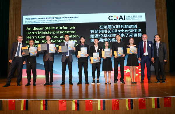欢迎仪式结束后举行中德工程师学院2018届部分毕业生学位授予仪式及2018级新生开学典礼,米乐官网和德方合作院校领导在君特的见证下共同为学院18届毕业生授予学位及为18级新生颁发奖学金证书。