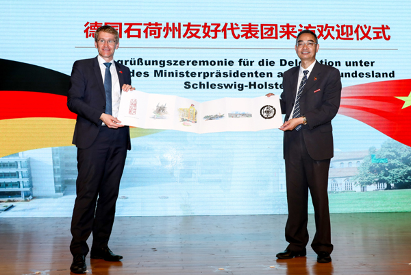 9月19日,德国石荷州州长丹尼尔•君特(Daniel Günther)率代表团来米乐官网安吉校区访问并参加中德工程师学院2018届部分毕业生学位授予仪式及2018级新生开学典礼。省教育厅副厅长于永明、校党政班子成员、安吉县副县长任贵明出席欢迎仪式。校党委书记龚建立向君特赠送纪念礼物。欢迎仪式由校党委副书记周加敏主持。