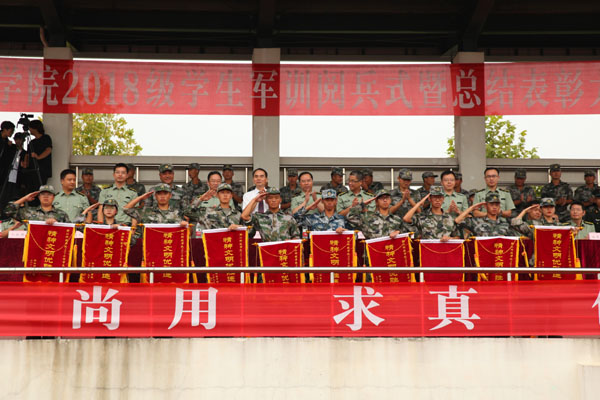9月22日上午, 2018级学生军训阅兵式暨总结表彰大会在安吉校区田径场举行。校长叶高翔、校党委副书记赵东福、副校长冯军和承担本次军训任务的中国人民解放军75210部队领导出席。副校长万健主持大会。