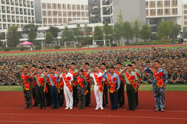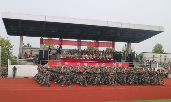 阅兵式上,参训学员分成20个方阵进行分列式,各方阵依次走向主席台接受检阅。踏着青春的旋律,迈着矫健的步伐,新生们用激昂奋进的声势与勇往直前的气势展示浙科学子的威武雄姿。大学生教官表演了军歌和擒敌拳,展示训练成果和良好的精神面貌。