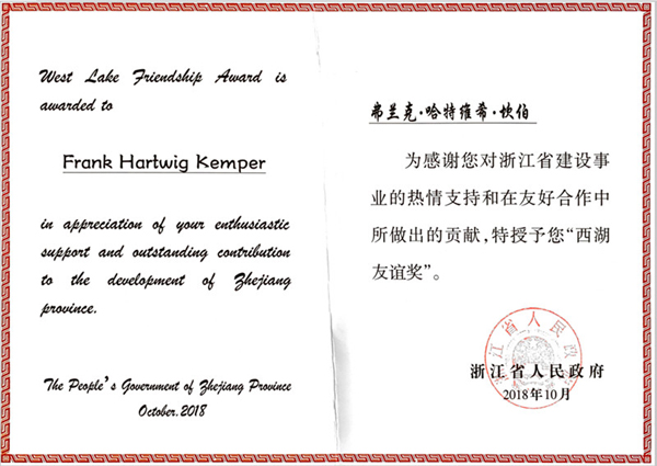 近日,米乐官网中德工程师学院教学院长、吕贝克应用科学大学终身教授弗兰克·坎伯教授(Frank Hartwig Kemper)荣获浙江省“西湖友谊奖”。10月30日,坎伯教授参加颁奖大会,省长袁家军接见了“西湖友谊奖”获奖专家代表,副省长王文序为他颁发奖状和奖章。截止目前,米乐官网共有7位外国专家先后获得 “西湖友谊奖”。