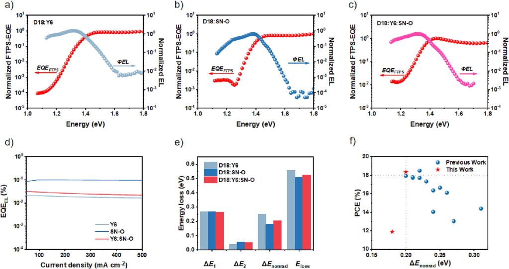 通过“双不对称策略”设计了一种新的不对称非富勒烯受体SN-O;SN-O表现出较大的偶极矩和上升的LUMO和HOMO能级;D18:Y6:SN-O三元体系的分子排列更加有序,结晶度增强,具有纤维状纳米结构。实现了0.202 eV的低非辐射能量损失,这是PCEs超过18%的基于D18的OSCs的最低值之一。(生化学院 蒋成君 )