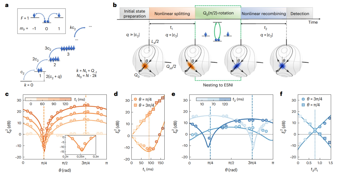 量子纠缠提供了超过标准量子极限的测量精度。然而,由于在制备、控制和检测量子纠缠方面的实验限制,具有较大增强的实验观测仍极具挑战性。本研究通过自旋混合动力学产生自旋-向列压缩态,利用26400个原子的大系综,实现了超越标准量子极限的15.6±0.5dB灵敏度,可用于检测小角度拉比Rabi旋转,以及16.6±1.1dB的灵敏度,可用于Ramsey干涉测量应用中的相位传感。该研究为基于超冷原子的精密测量应用奠定了基础。利用回声实现时间反演的方案可以直接推广到有类似相空间结构的Lipkin-Meshkov-Glick (LMG)模型中,从而为在其他自旋系统中实现非线性干涉仪提供了新的思路。