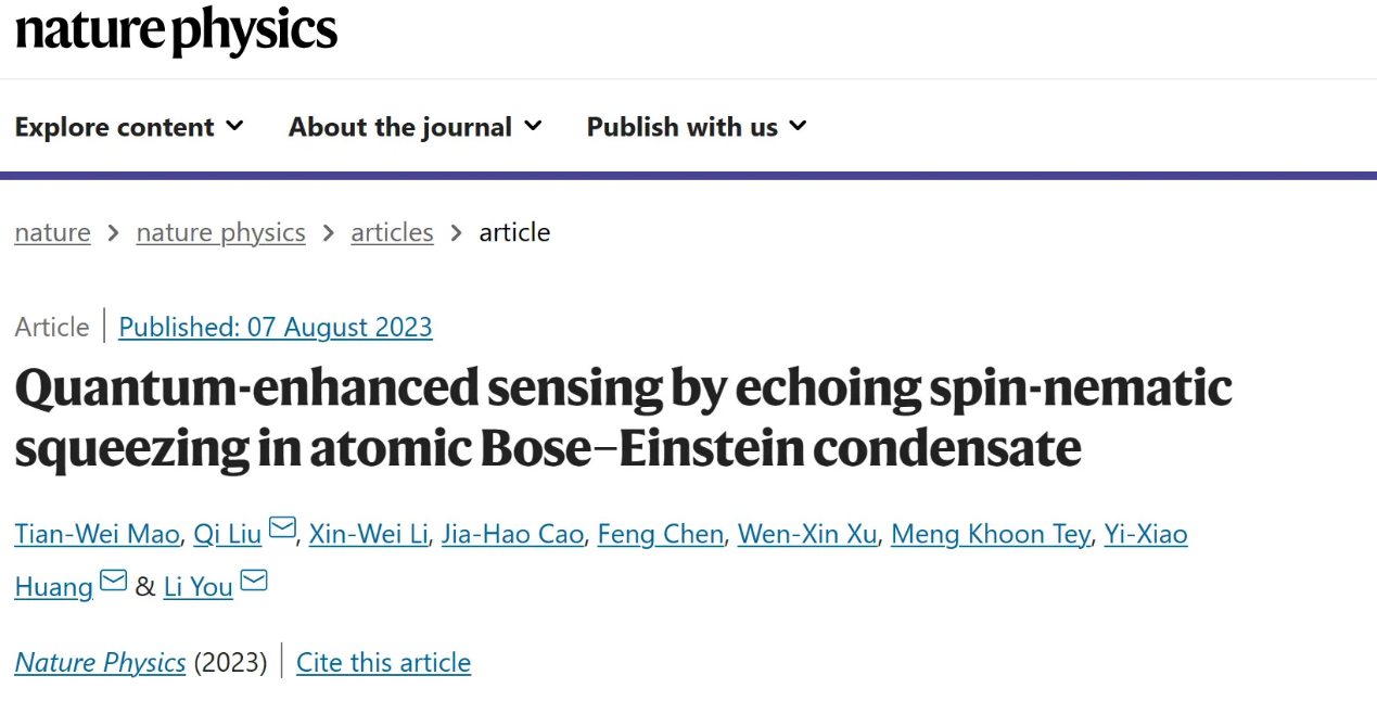 近日,米乐官网理学院物理学科量子信息团队教师与清华大学、法国索邦大学等单位合作,在量子精密测量研究方面取得突破性进展,利用自旋-向列压缩回声实现了测量精度量子增强的新纪录,相关研究论文“Quantum enhanced sensing by echoing spin-nematic squeezing in atomic Bose-Einstein condensate”在《Nature Physics》上发表。米乐官网理学院黄奕筱副教授和清华大学尤力教授、法国索邦大学刘奇博士为该论文的共同通讯作者。