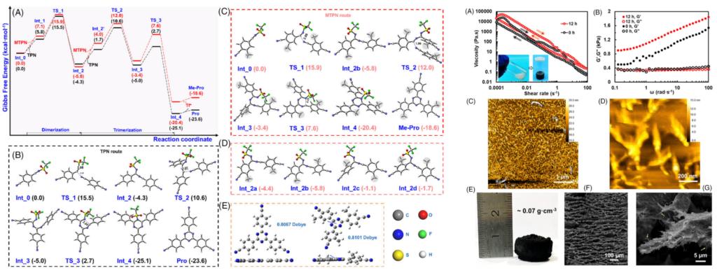 共价三嗪骨架(CTF)是一类具有高度共轭层状结构的新型聚合物材料,热与化学稳定性优异,在气体吸附、催化、储能等多个领域引起了研究人员的极大兴趣。然而,受CTF分子间强烈相互作用和高度空间堆积特性所限,目前CTF大多以不溶性固体微粒而非以剥离态纳米片的形式存在和使用,难以充分发挥其最大潜力。开发简单温和、经济高效的合成方法以获得剥离态CTF纳米片,仍然具有相当大的挑战。本研究在密度泛函理论计算基础上,将甲基结构引入CTF分子,增强CTF的极性并削弱其层间相互作用,从而使其可在特定溶剂中实现快速剥离,获得纳米胶体。将该CTF纳米胶体用于碳纳米管(MWCT)的物理改性,还可制得一种新型CTF/MWCT复合有机凝胶,并显示出在催化、光热转换、传感器等领域的应用潜力。