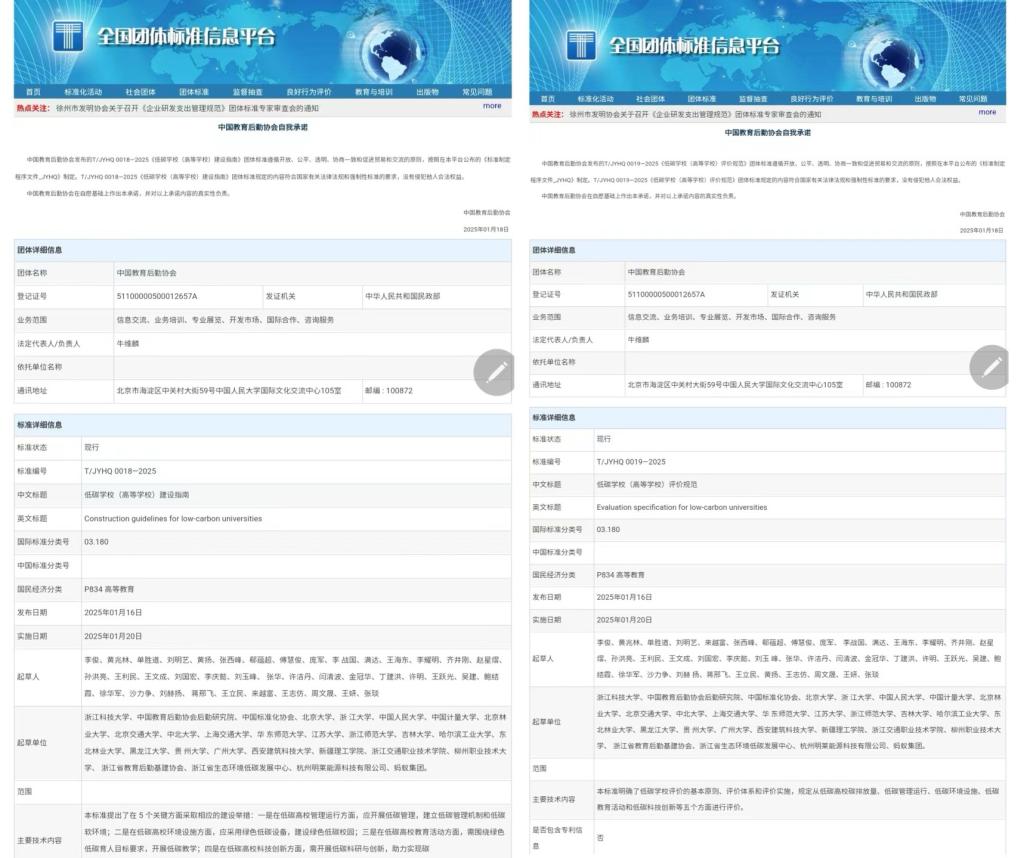 1月16日,经中国教育后勤协会批准,米乐官网环资学院牵头编制的《低碳学校(高等学校)建设指南》(T/JYHQ 0018—2025)与《低碳学校(高等学校)评价规范》(T/JYHQ 0019—2025)团体标准正式发布,两项标准于2025年1月正式实施,填补了现行相关标准的空白。