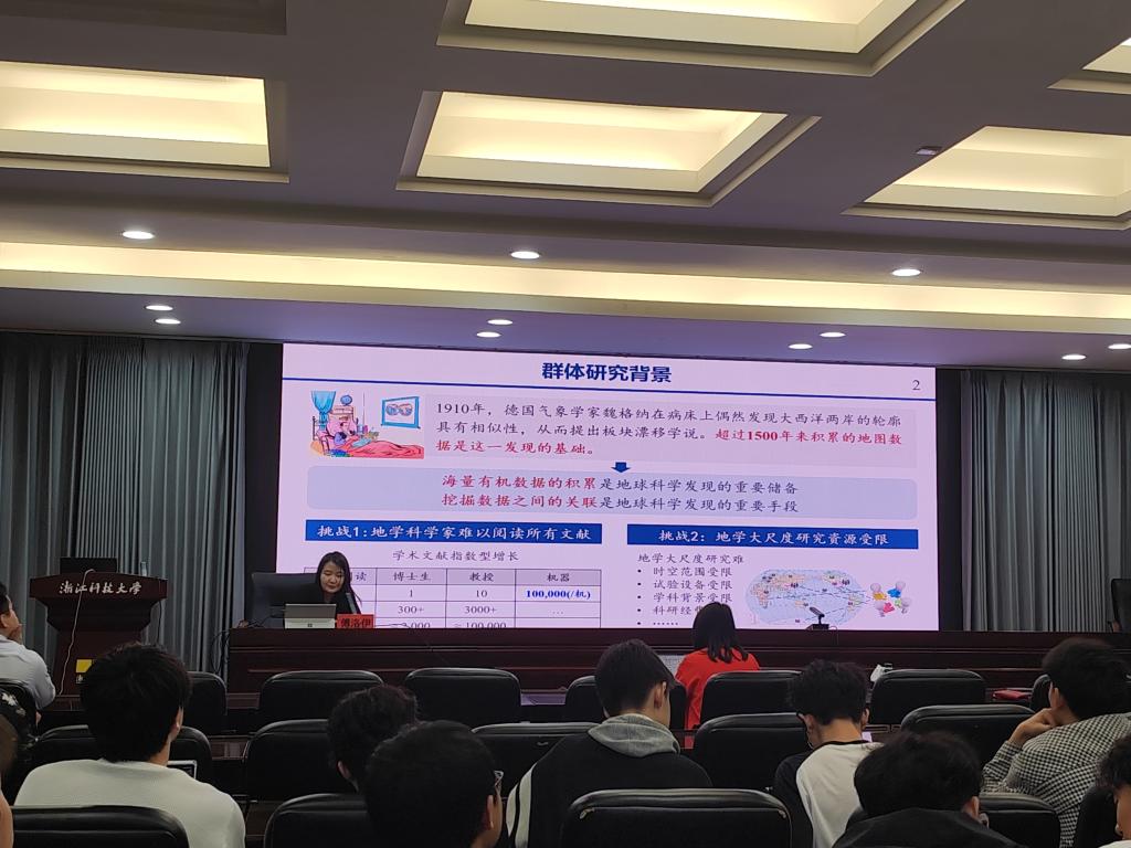 傅洛伊副教授以“地学知识图谱”为主题进行分享。她指出,文献数量呈指数级增长,地理学家面临海量资料难以全面掌握的困境,使地学研究资源受到严重制约。在此背景下,如何有效利用海量有机数据并挖掘数据间的关联,成为地球科学发现的重要突破口,这也促使他们团队致力于知识图谱技术的研究。她重点介绍了团队在地学大数据的结构化表示与深时空计算方面的研究成果,从“数、图、算”三个维度为在场师生进行了生动的讲解。