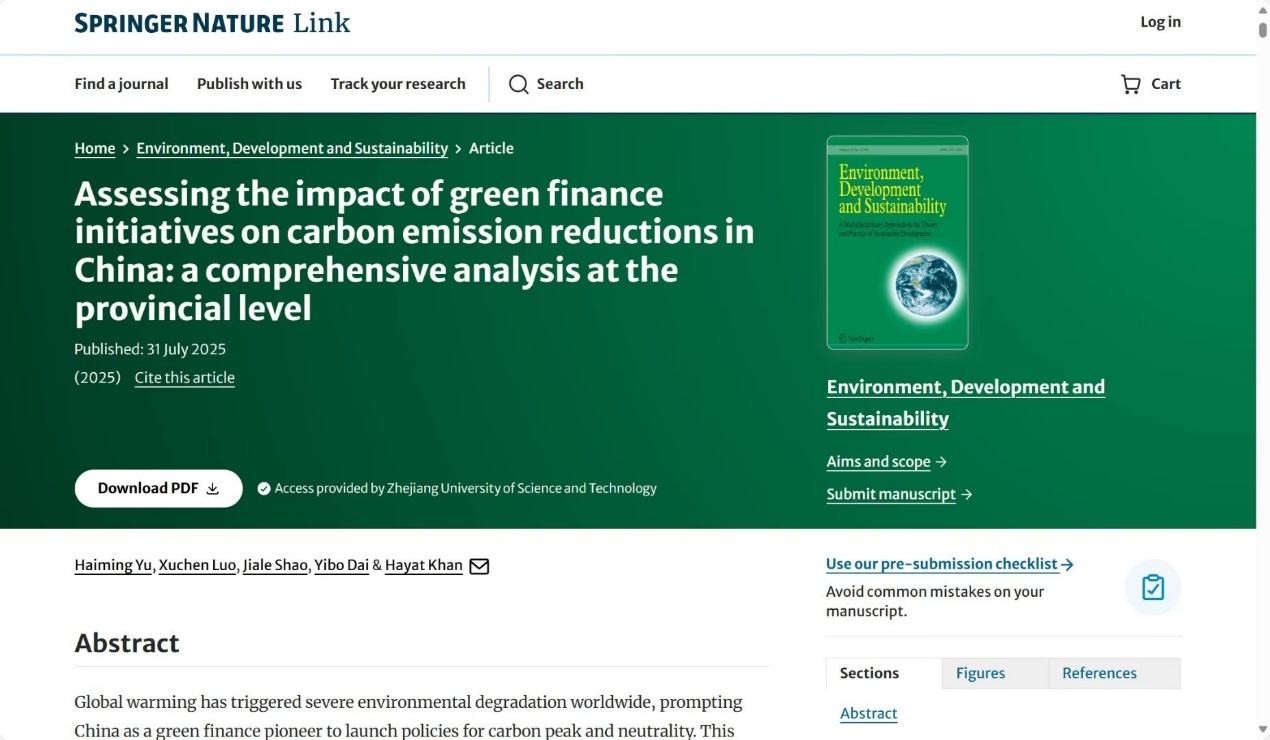近日,经济学院教师于海明撰写的《Examining the Impact of Green Finance Initiatives on Carbon Emission Reductions in China: A Comprehensive Analysis at the Provincial Level》论文在《Environment, Development and Sustainability》上发表,广东外语外贸大学的Hayat Khan教授为论文通讯作者,22级经济学(中美班)罗旭晨、戴逸博,22级大数据(中法班)邵嘉乐等同学参与论文撰写。《Environment, Development and Sustainability》为SCI收录期刊,其影响因子为4.2(中科院3区,JCR2区),这也是经济学院首次有本科生参与发表SCI论文。
