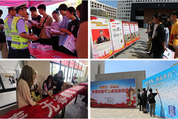 由校保卫处、安吉校区学生事务中心联合安吉校区属地街道、新时代文明实践所、公共事业服务中心和派出所等部门开展以“喜迎建国七十周年,合力打造平安校园”为主题的系列安全宣传活动。举办现场互动交流、咨询讲解、知识竞答等形式向师生普及防电信网络诈骗、防盗抢、拒绝“黄赌毒”、 消防安全及交通安全、食品药品安全、应急逃生自救等各方面的常识与技能;通过情景模拟体验,让各位同学对犯罪行为有了直观认识;现场分发宣传手册,帮助同学们解相关的法律法规并以此规范个人行为准则。同时开展了宣传垃圾分类、文明创建、新时代文明实践等重点中心工作。