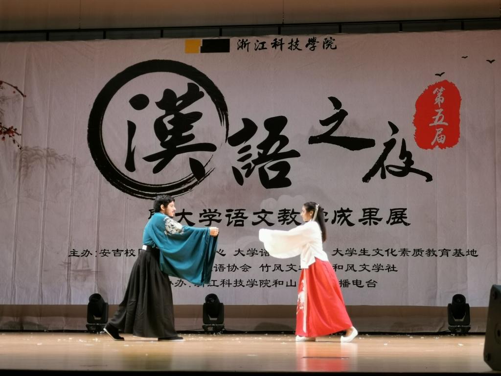 12月26日晚,第五届“汉语之夜”暨大学语文教研成果展在安吉校区大学生活动中心举行。安吉校区教学事务中心、人文与国际教育学院大学语文教研室、校大学生文化素质教育基地相关负责人及学生社团代表等1000多人一同观看了展演。
