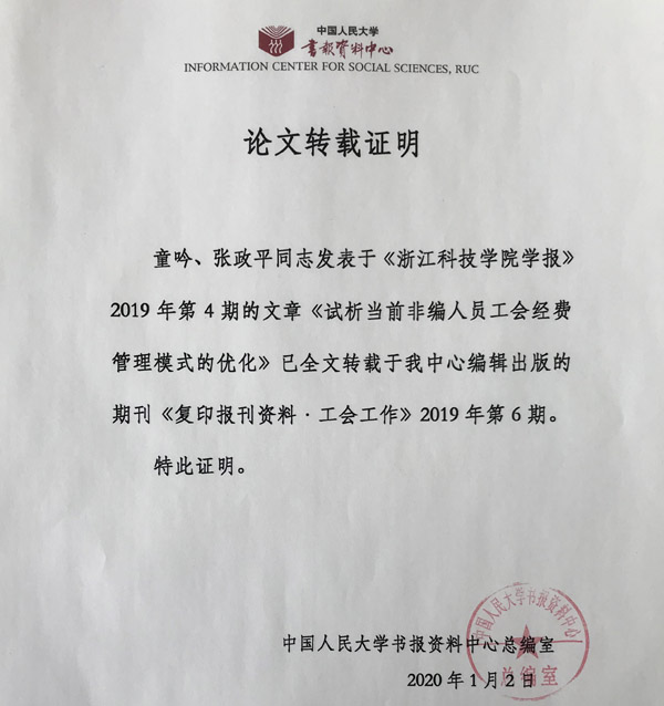 近日,从中国人民大学复印报刊资料数据库获悉,《浙江科技学院学报》2019年第4期刊发的论文《试析当前非编人员工会经费管理模式的优化》,被人大复印资料《工会工作》2019年第6期全文转载。