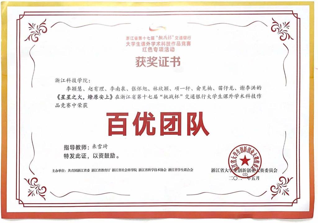 近日,浙江省第十七届“挑战杯”大学生课外学术科技作品竞赛红色专项活动落下帷幕,经激烈角逐,米乐官网理学院“星星之火,燎原安上”团队获百优团队荣誉称号。