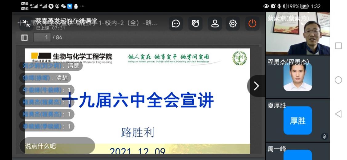 12月9日,生化学院召开全院教职工大会,通过线上线下结合的方式进行党的十九届六中全会精神宣讲。