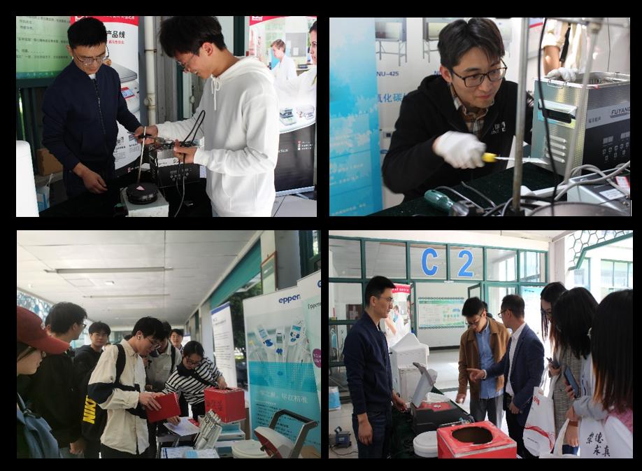 4月27日,生化学院联系浙江纳德科学仪器有限公司,开展“大篷车”进校园科研仪器维修活动。在C2教学区一楼大厅展纳德公司8名工作人员现场为教师进行仪器维修服务,并进行仪器养护的答疑解惑。对于无法现场维修的设备,工作人员也进行了登记,并整理好带回公司维修;对于不便移动的设备,则安排工程师直接到实验室现场维修。现场维护移液枪30余把、其它设备20余台,工程师走进实验室维护设备10台。