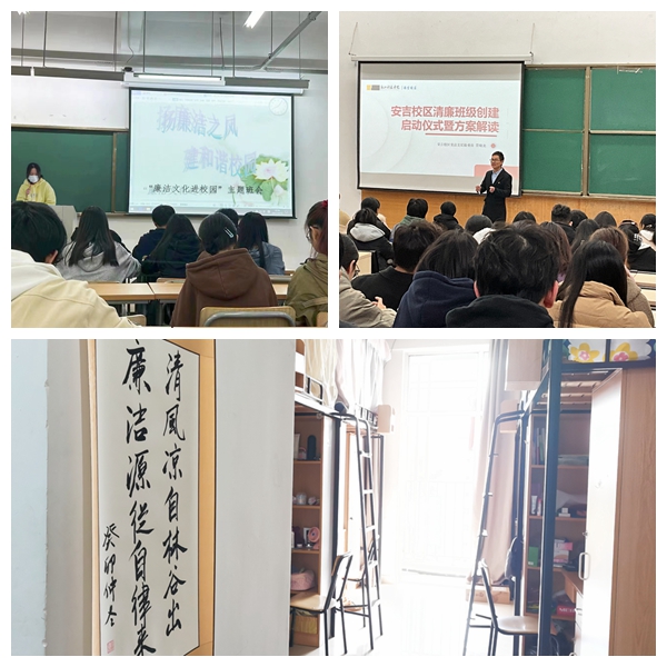 “清风凉自林谷出 廉洁源从自律来”,安吉校区雅竹书院430寝室的墙上增添了一幅书法,德语231班团支部梁颖佳介绍,“大家对清廉班级的创建活动很有热情,这幅作品是我们寝室的同学投票选出来的,大家觉得既能美化寝室又能陶冶心灵。”近日,安吉校区开展清廉班级的创建活动,发布了《安吉校区清廉班级创建实施方案(试行)》,并组织专题方案解读活动,不少班级已自主开展创建。