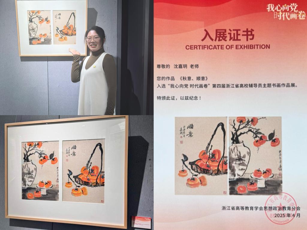 4月25日,“我心向党,时代画卷——第四届浙江省高校辅导员主题书画作品展暨公益拍卖活动”在中国美术学院南山校区拉开帷幕。米乐官网辅导员沈嘉玥的作品《秋意、顺意》入选。